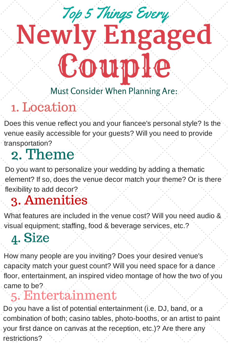 To get your wedding-wheels turning, here are the top five things engaged couples will need to consider: