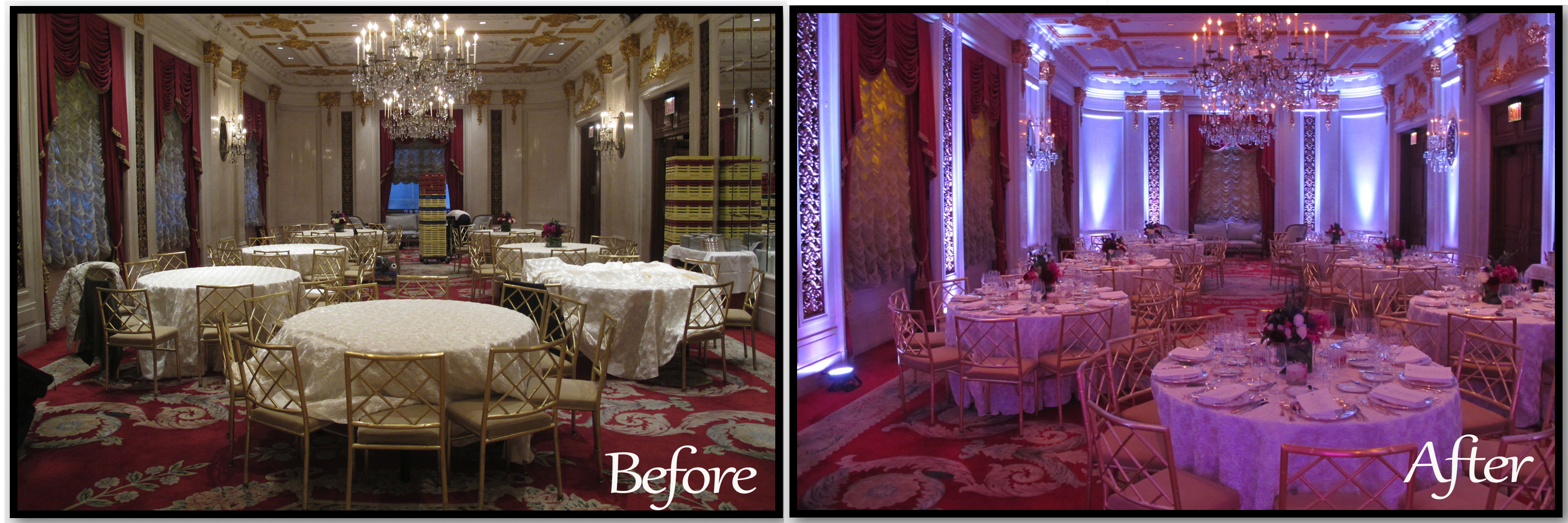 Yes, the newly added tables with beautiful centerpieces and DJ setup add to the change of ambiance, but lighting is the game changer that transports your guests to the next chapter of your wedding day.